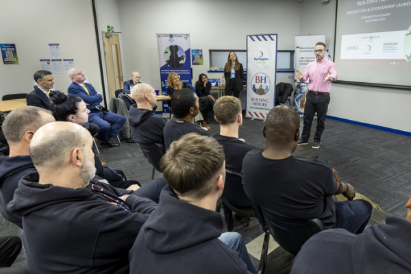 Building Heroes CEO Chris Charles congratulates Darlington learners on their graduation while outlining the impact of the new Academy sponsorship by Lovell and Morgan Sindall Construction.